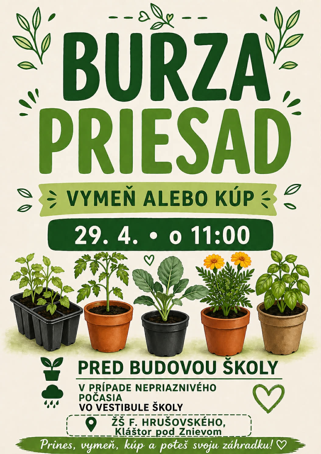 Pozývame všetkých žiakov, rodičov aj priateľov školy na Burzu priesad, kde môžete svoje rastlinky vymeniť alebo si odniesť nové kúsky do svojej záhrady. ????