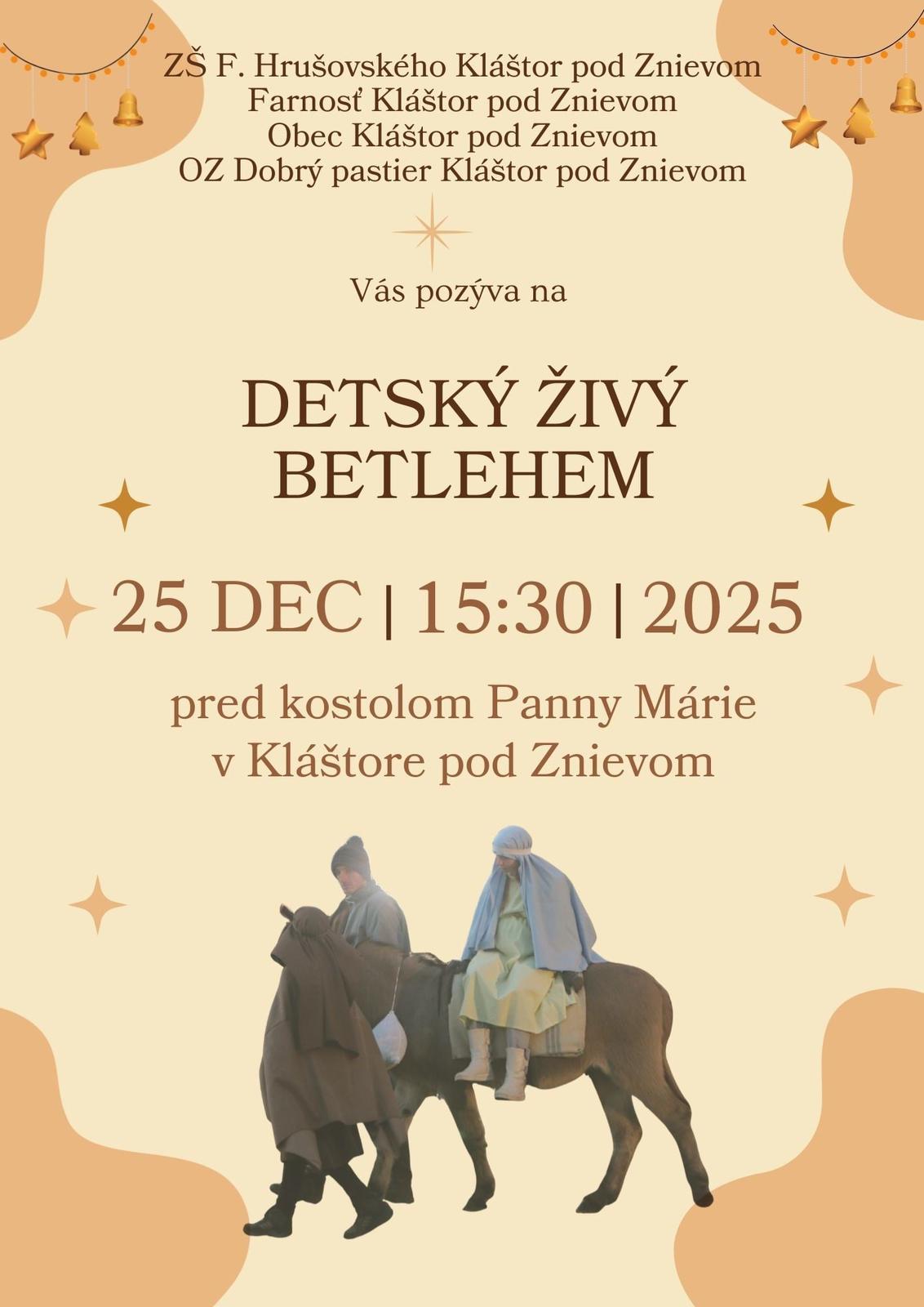 Obec Kláštor pod Znievom pozýva obyvateľov aj návštevníkov na tradičné vianočné divadelné predstavenie Detský živý betlehem, ktoré sa uskutoční 25. decembra 2025 o 15.30 hod. pred Kostolom Panny Márie na Gymnaziálnej ulici v Kláštore pod Znievom.